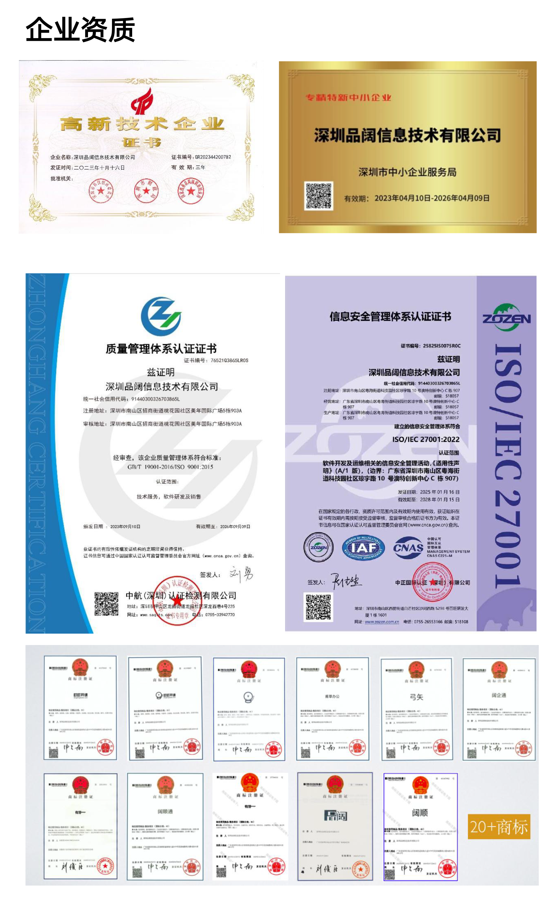 深圳品阔信息技术有限公司成立于2014年,实缴注册资本金1680.28万元,先后于2017年、2020年、2023年三次荣获“国家级高新技术企业”称号,2023年获得“专精特新企业”称号。 品阔信息总部位于深圳,并以上海、杭州、成都三大区域分公司为支点,构建覆盖华东、西南、华南的全国性技术服务网络。公司已累计获得专利授权20项(发明专利18项)、软件著作权40余项,研发能力覆盖人工智能、大数据、安全通信等前沿领域。2023年通过了ISO9001质量管理体系认证,2024年通过了ISO27001信息安全管理体系认证,多年来服务了众多标杆企事业单位,包括海外银行、国内银行、国企、上市公司、大学等。服务内容包括软件开发、软件测试、软硬件销售以及部分运维、翻译工作,品阔的团队是一支高效专业的队伍,具备丰富的研发经验和深厚的技术实力,致力于为客户特别是银行客户提供卓越的服务和解决方案。